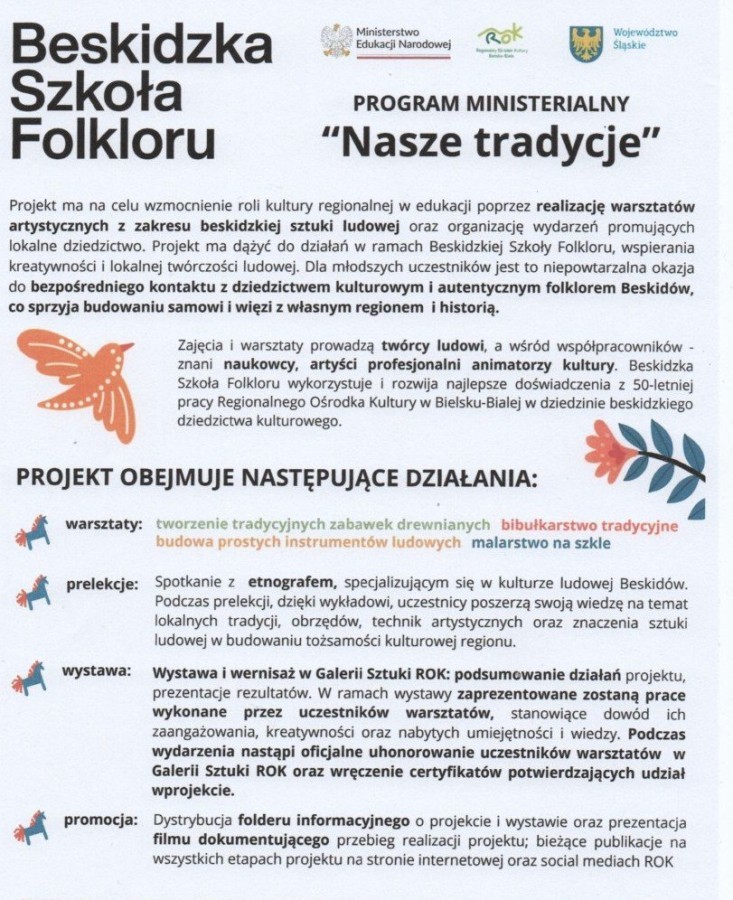 Nasza Szkoła zakwalifikowała się do Ministerialnego programu „Nasze Tradycje”, którego celem jest wzmocnienie roli kultury regionalnej w edukacji poprzez realizację warsztatów artystycznych.