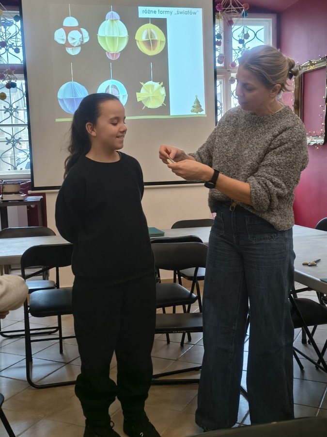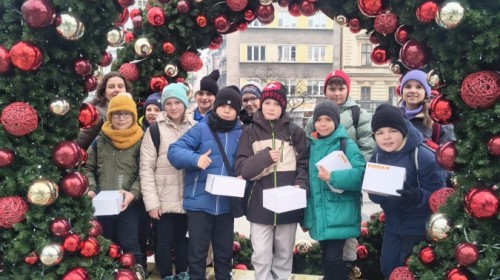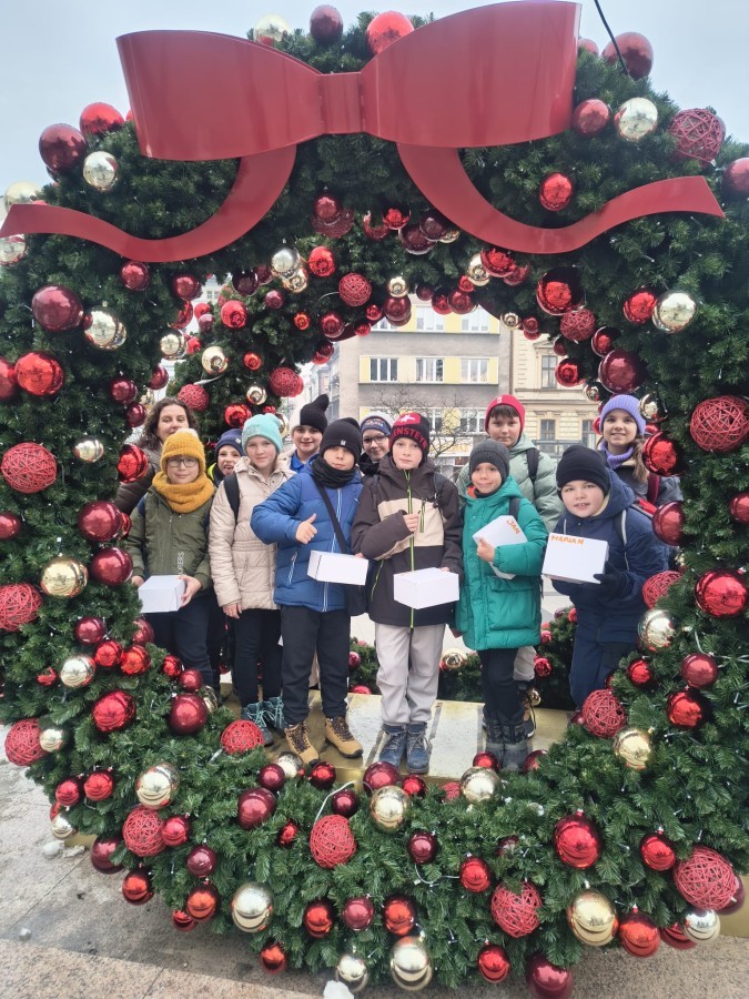 W części praktycznej uczniowie wykonali starodawne ozdoby choinkowe z opłatka tzw. światy . Każdy zabrał swoje dzieło do domu. W drodze powrotnej do szkoły klasie udało się zrobić wspólne zdjęcie na placu Chrobrego.